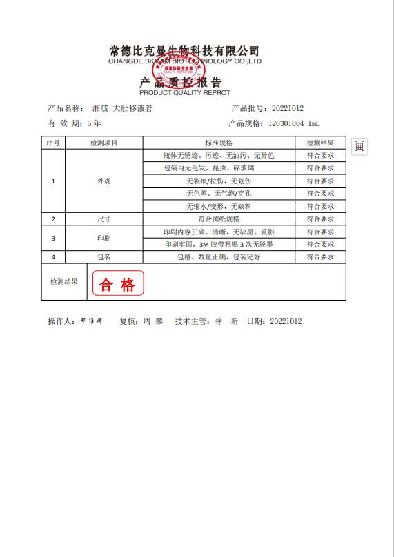 120301004 湘玻 大肚移液管 1mL 20221012