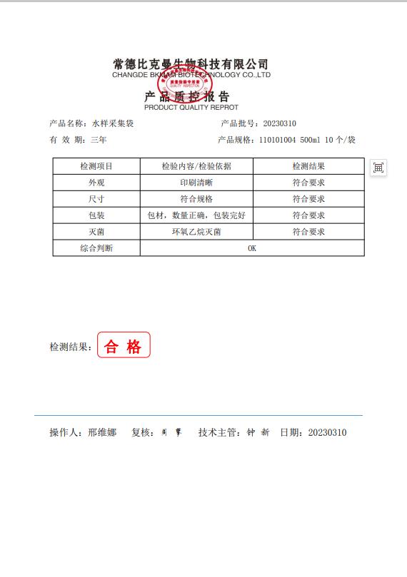 110101004 比克曼生物 水樣采集袋 (含硫) 500ml 10個袋 20230310